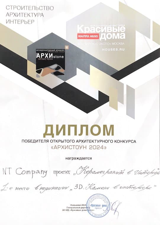В номинации «3D-проекты – камень в интерьере» он занял 1-ое место.