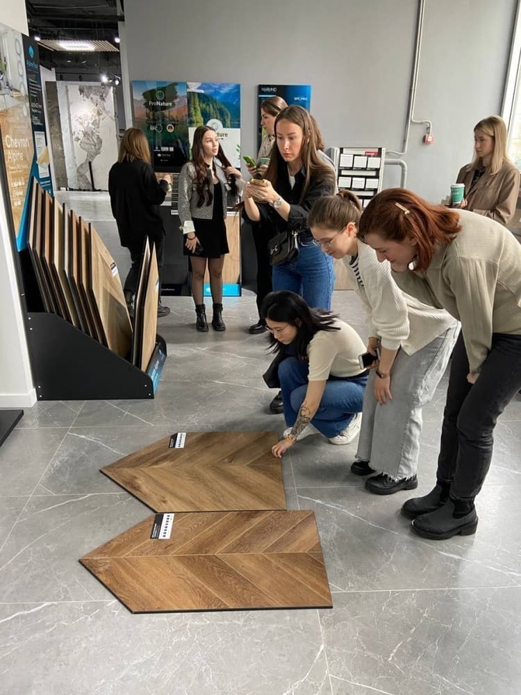 Комплектаторам компании «DOMEO» был продемонстрирован полный ассортимент различных товарных направлений. Базой презентации стали напольные покрытия, их виды, технические характеристики и преимущества: LVT, SPC, ABA, ламинат, инженерная доска.